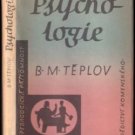 Těplovova Psychologie podává souhrn výsledků, jichž dosáhla sovětská psychologická věda, vycházející z důsledně vědeckého světového názoru - z dialektického materialismu. 4. vydání je až na stylistické úpravy přetiskem třetího. Obs.: Úvod (předmět psychologie, klasifikace duševních procesů, psychika a činnost, methody zkoumání duševního života člověka, význam psychologie). Kap. I. Vývoj psychiky. II. Počitky. IIII. City. IV. Pozornost. I. Vnímání. II. Paměť. VII. Obrazotvornost (fantasie) VII. Myšlení a řeč. IX. Vůle. X. Psychologický rozbor činnosti. XI. Psychologická charakteristika osobnosti. - Na konci každé kapitoly jsou uvedeny otázky pro opakování a úlohy.