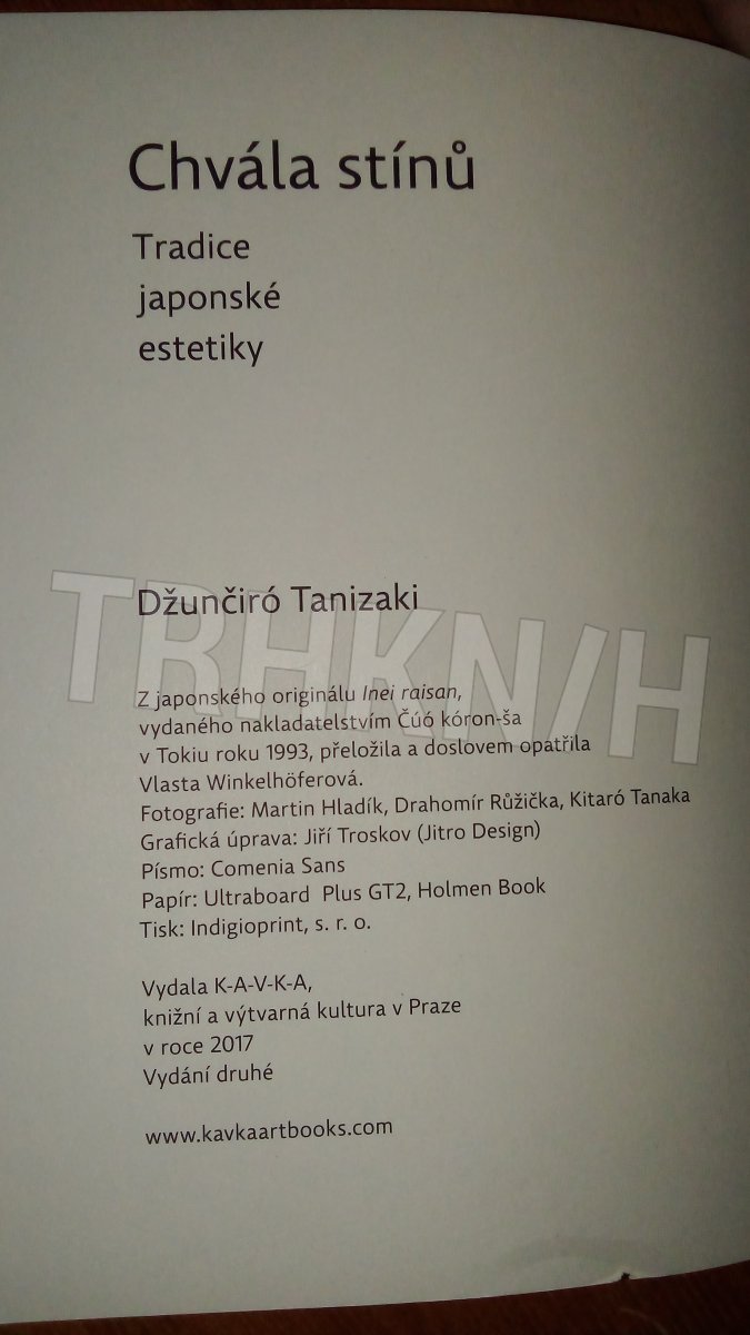 Džuničiró Tanizaki patří k nejvýznamnějším představitelům japonské moderní literatury. Ve své eseji Chvála stínů ukazuje, jak světlo a stín ovlivňují vnímání japonského prostoru, předmětů, lidských tváří nebo chutí jídla, jak běžnou každodennost provází synergie celé řady vjemů, činící ze života estetický zážitek. Zabývá se důvody, z kterých se touha po stínu zrodila, i významy, které v sobě nese. Tanizaki se stal obráncem tradiční japonské kultury v době, kdy Japonsko začalo vzhlížet k západu jako k nekonečné inspiraci moderního života. Svou esej napsal ve třicátých letech 20. století, její poselství je však nadčasové. I v západní kultuře tušíme existenci vzájemných souvislostí mezi úkony a předměty a právě Tanizakiho skvělý jemnocit provázený jazykovým mistrovstvím je pro nás odhaluje. Nové české vydání vychází ve volné řadě esejů o japonské estetice, v níž dosud vyšla kniha Leonarda Korena Wabi-sabi pro umělce, designéry, básníky a filozofy.