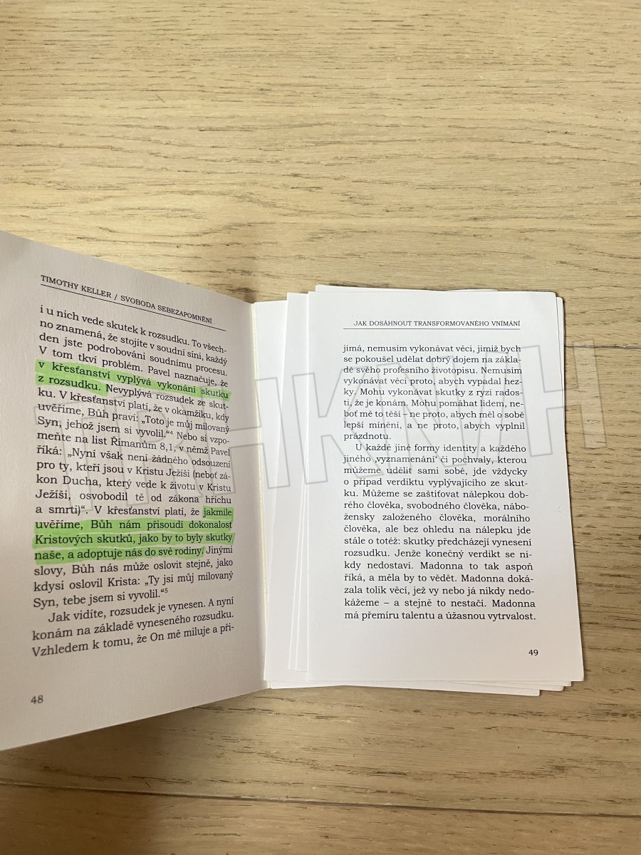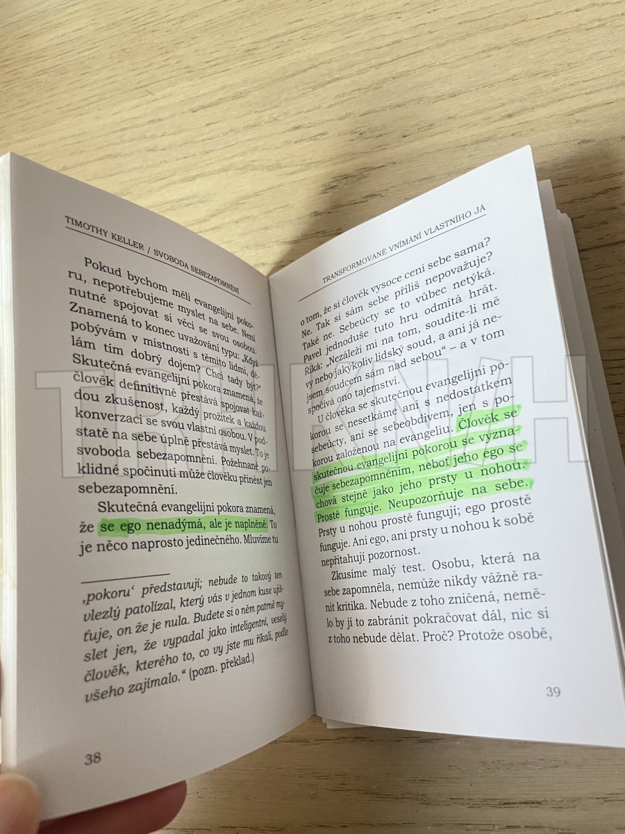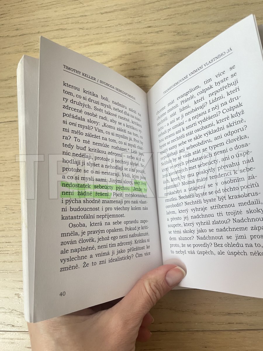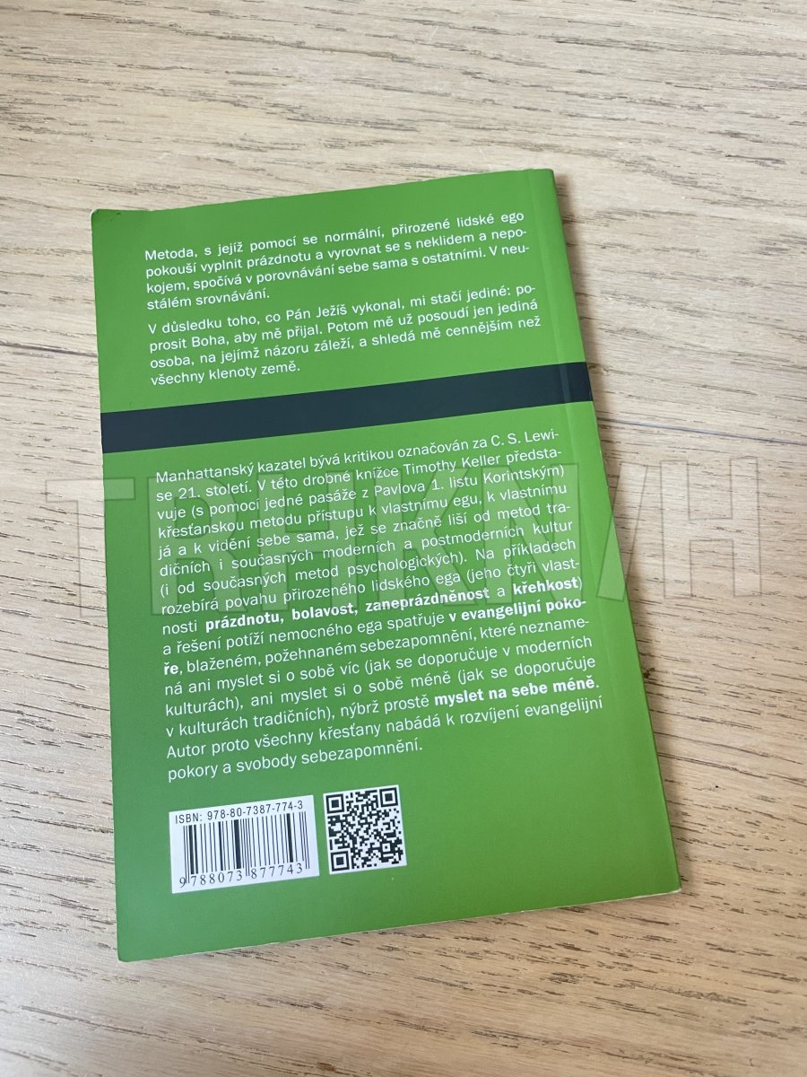 Manhattanský kazatel bývá kritikou označován za C. S. Lewise 21. století. V této drobné knížce Timothy Keller představuje (s pomocí jedné pasáže z Pavlova 1. listu Korintským) křesťanskou metodu přístupu k vlastnímu egu, k vlastnímu já a k vidění sebe sama, jež se značně liší od metod tradičních i současných moderních a postmoderních kultur (i od současných metod psychologických). Na příkladech rozebírá povahu přirozeného lidského ega (jeho čtyři vlastnosti prázdnotu, bolavost, zaneprázdněnost a křehkost) a řešení potíží nemocného ega spatřuje v evangelijní pokoře, blaženém, požehnaném sebezapomnění, které neznamená ani myslet si o sobě víc (jak se doporučuje v moderních kulturách), ani myslet si o sobě méně (jak se doporučuje v kulturách tradičních), nýbrž prostě myslet na sebe méně. Autor proto všechny křesťany nabádá k rozvíjení evangelijní pokory a svobody sebezapomnění.
