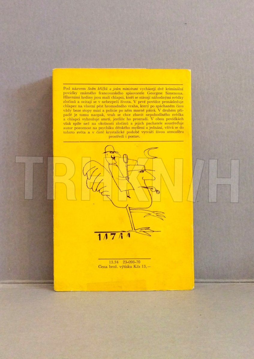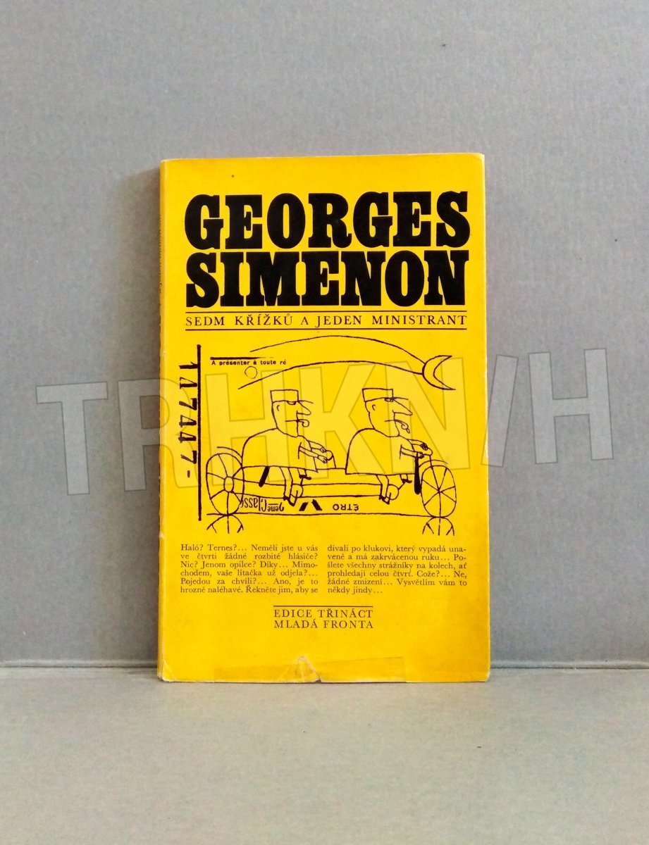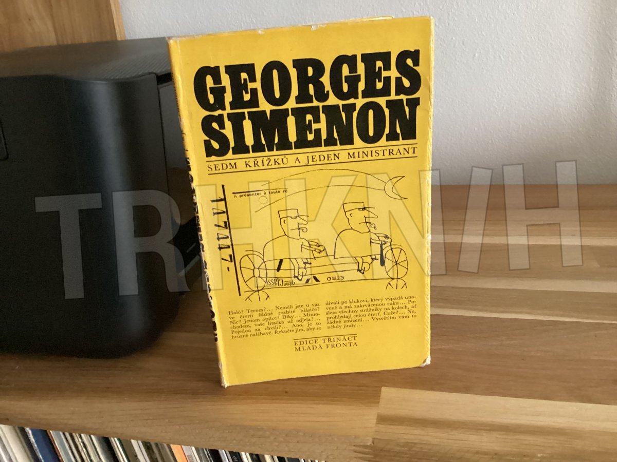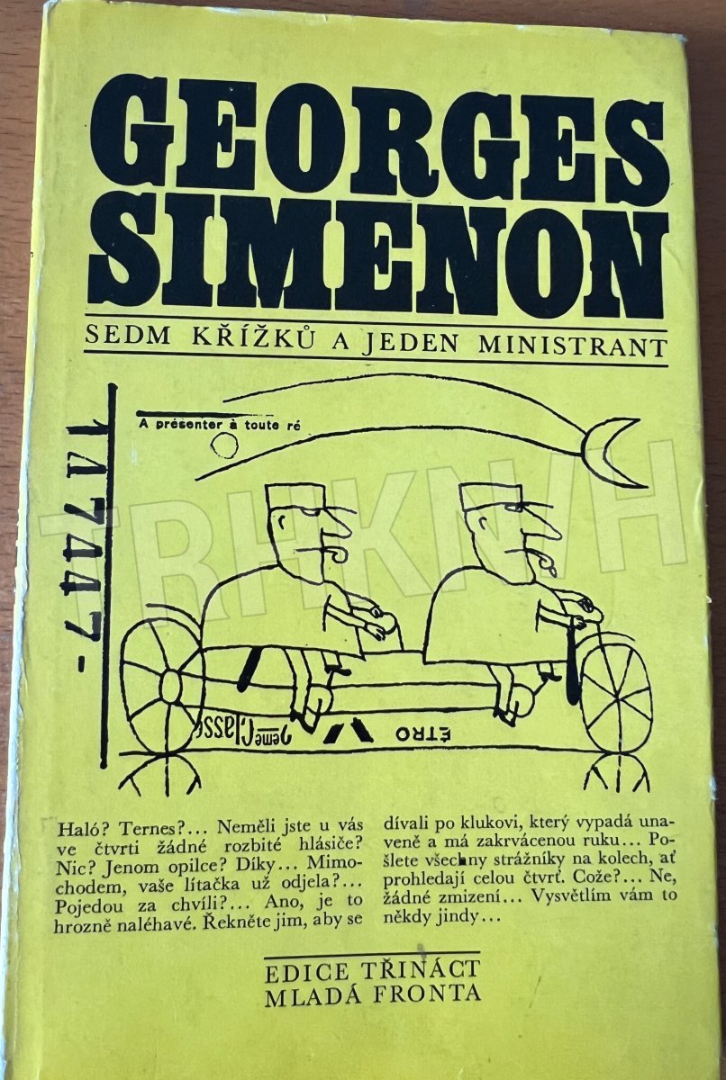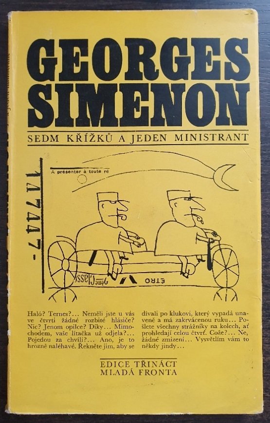 Tahle kniha je „Sedm křížků a jeden ministrant“ od Georgese Simenona, vydaná v Edici třináct u Mladé fronty. Už podle typického žlutého přebalu a grafického stylu je jasné, že jde o titul z populární řady napínavých a detektivních příběhů.