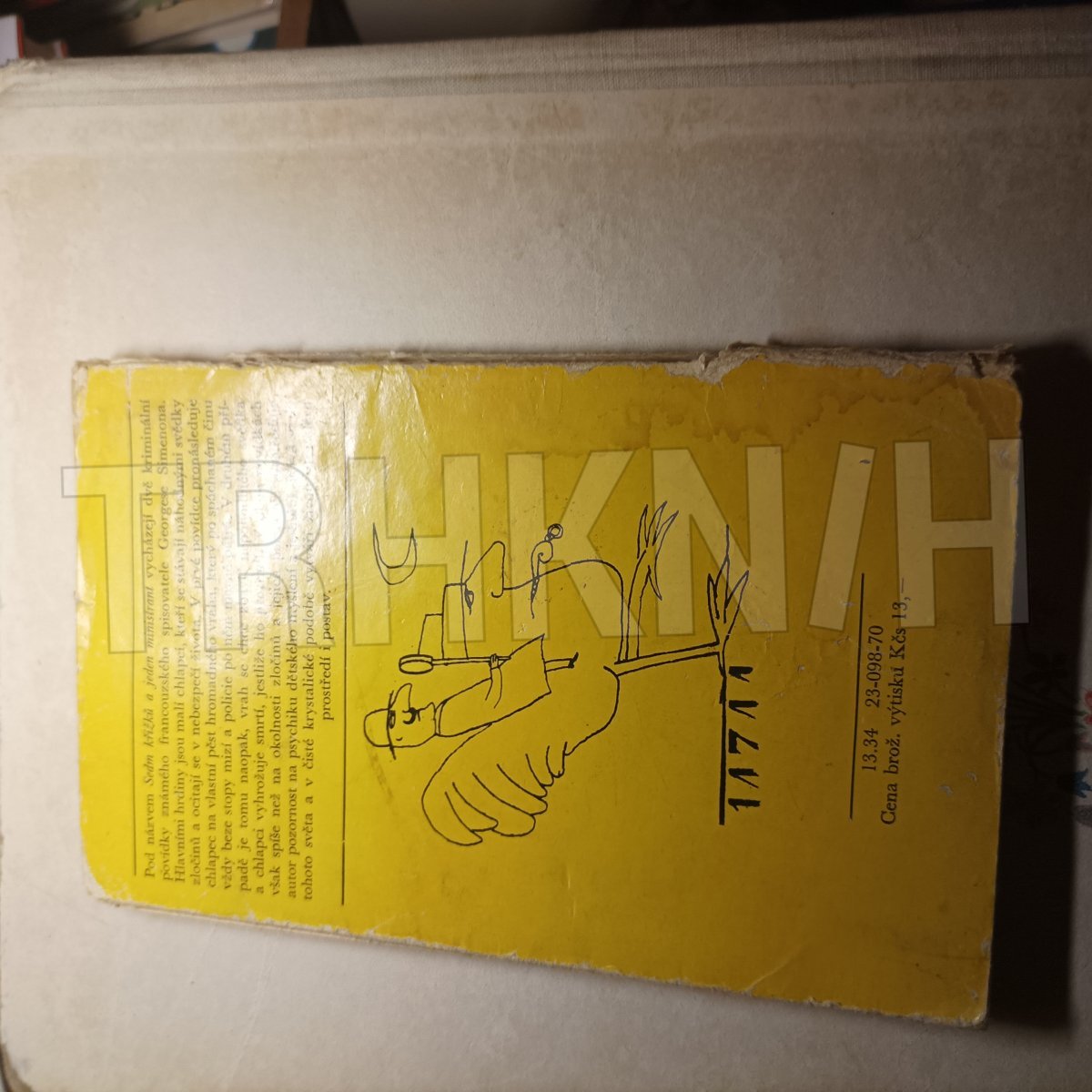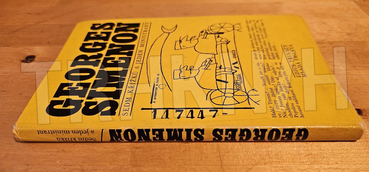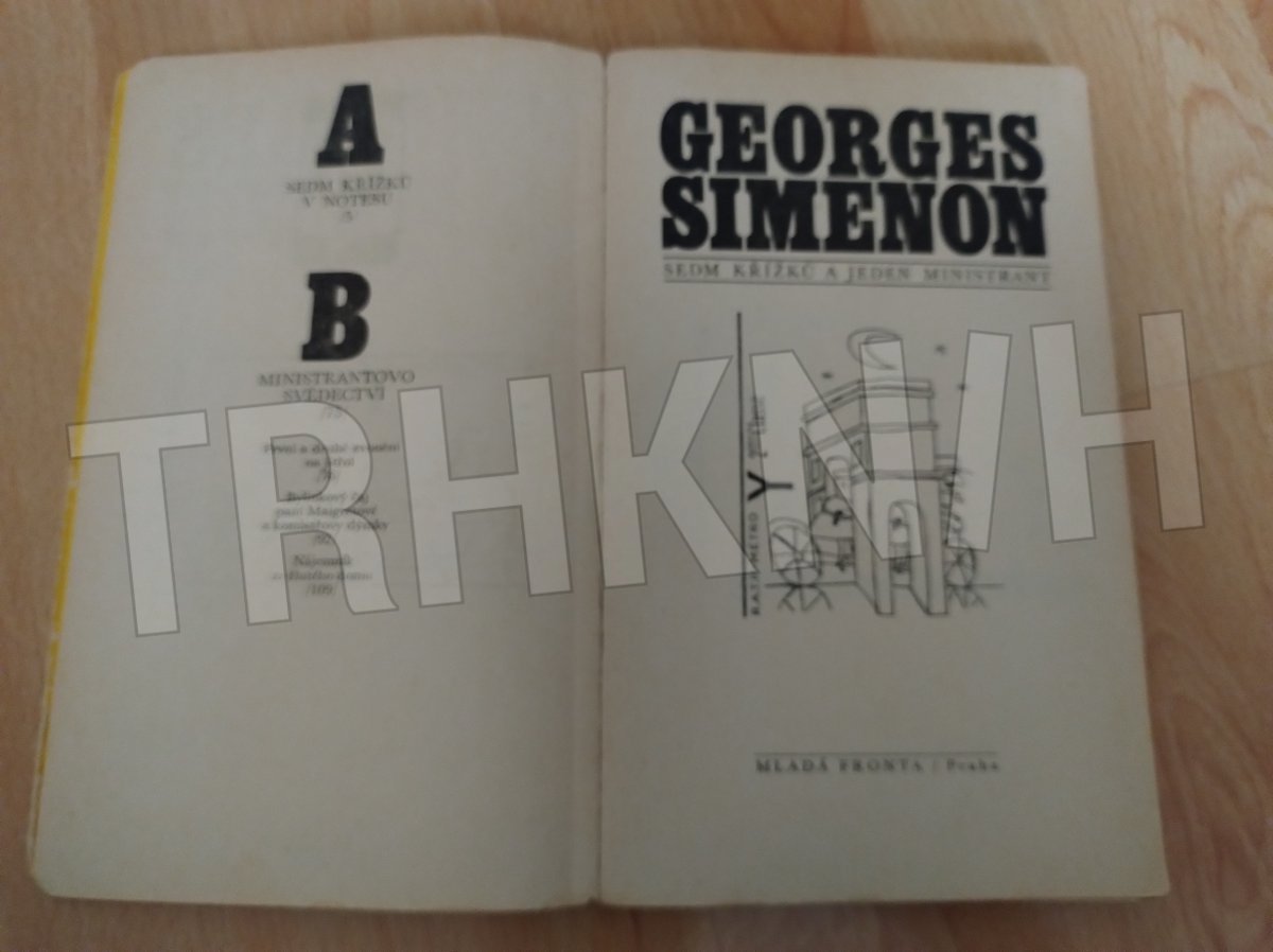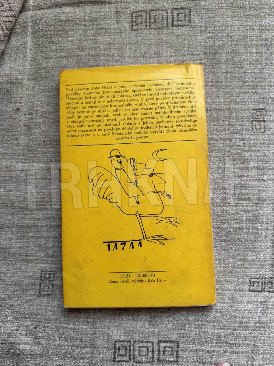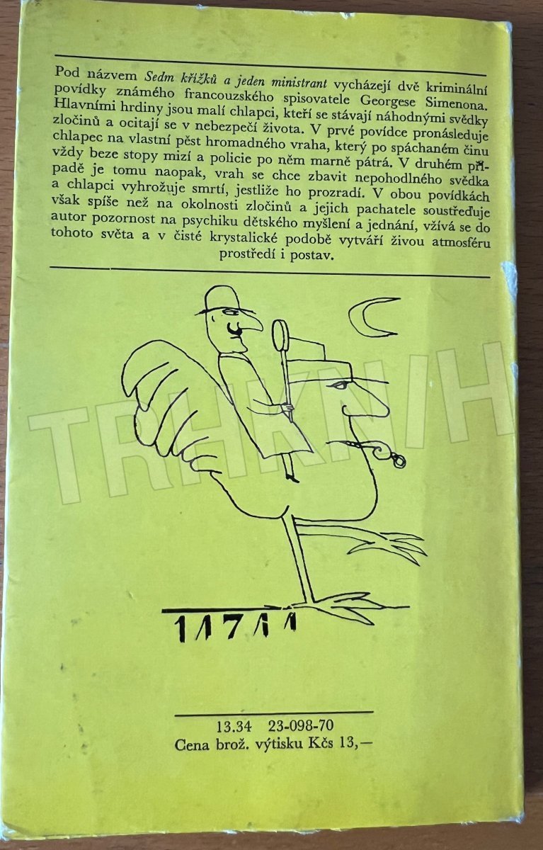 Tahle kniha je „Sedm křížků a jeden ministrant“ od Georgese Simenona, vydaná v Edici třináct u Mladé fronty. Už podle typického žlutého přebalu a grafického stylu je jasné, že jde o titul z populární řady napínavých a detektivních příběhů.